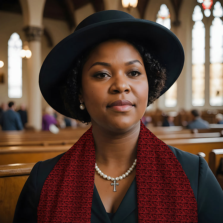 The phrase "The all-powerful blood" forms the pattern on this red, black, and gray scarf. It is soft, lightweight, and versatile—able to be worn in several different ways. This beautiful scarf for Christian women is available in two finishes: