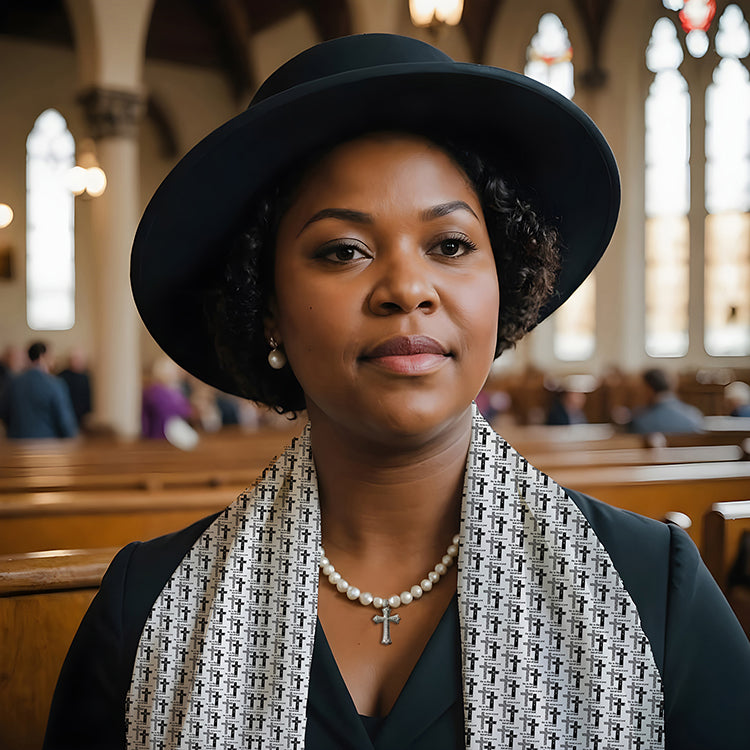 Christ is Lord" and "He is the Son of God" are printed with crosses throughout this white and black scarf. It is soft, lightweight, and versatile—able to be worn in several different ways. This Christian scarf is available in two finishes: