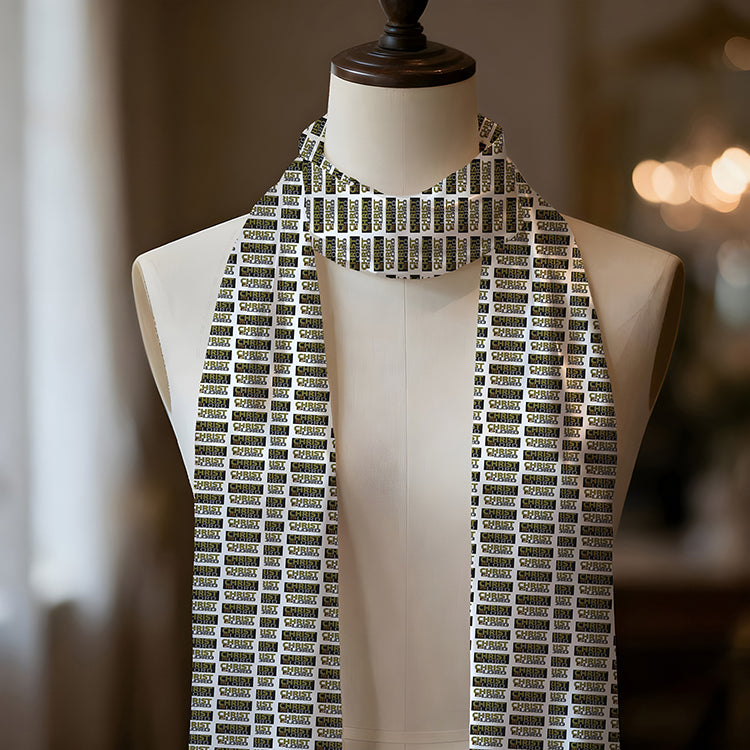 The phrase "Christ is Lord" in silver, gold, bronze, and black forms the pattern on this scarf. It is soft, lightweight, and versatile—able to be worn in several different ways. This scarf for Christian women is available in two finishes: