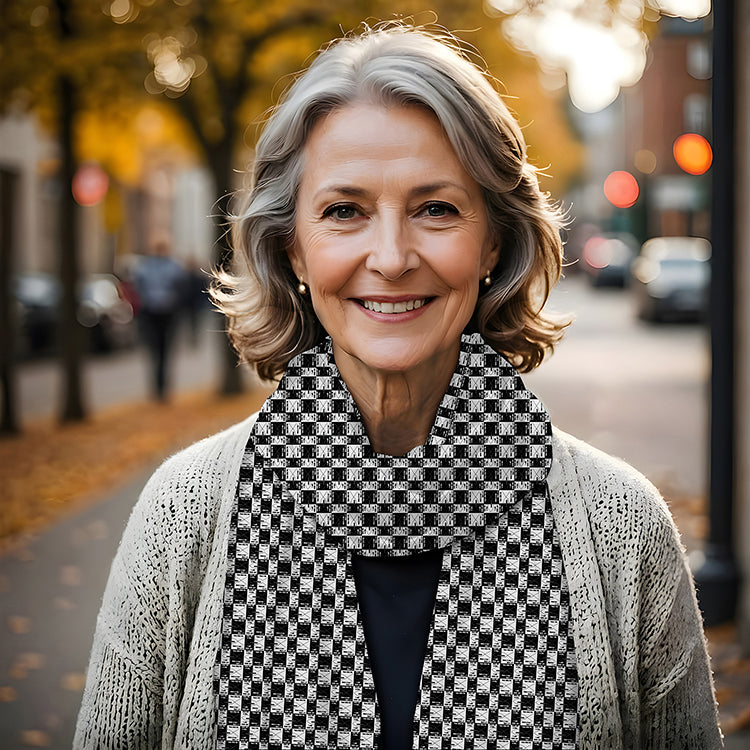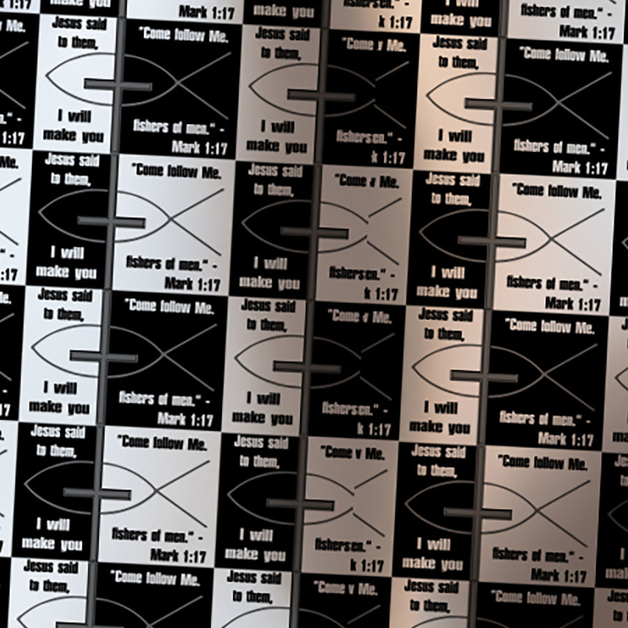 An ichthys with a cross inside is printed with scripture on this black and white checked scarf. The accessory is soft, lightweight, and versatile—able to be worn in several different ways. This Christian scarf is available in two finishes: