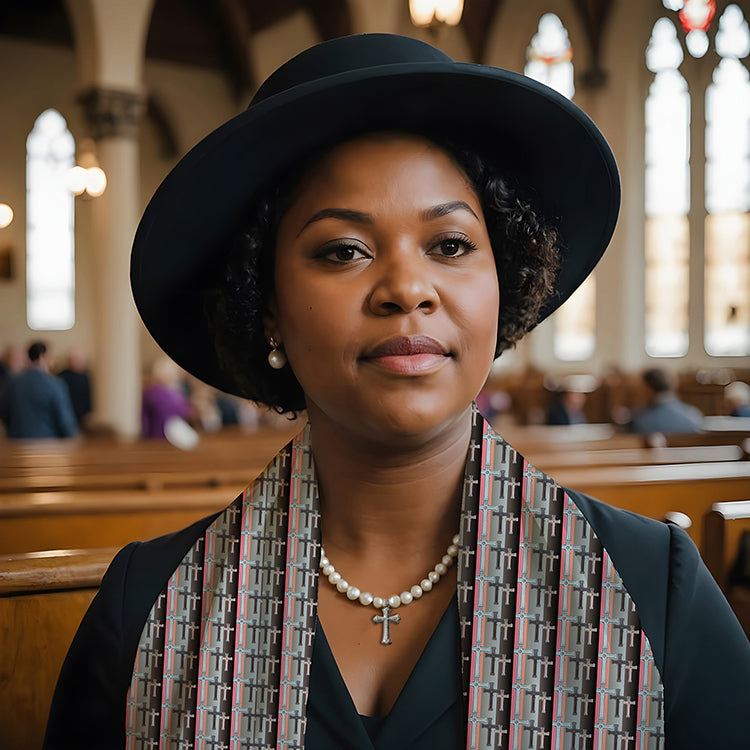 Crosses are printed throughout this beautiful striped scarf. It is soft, lightweight, and versatile—able to be worn in several different ways. Thid Christian scarf is available in two finishes: