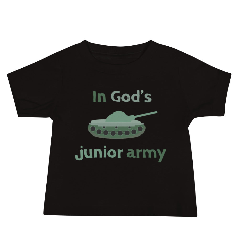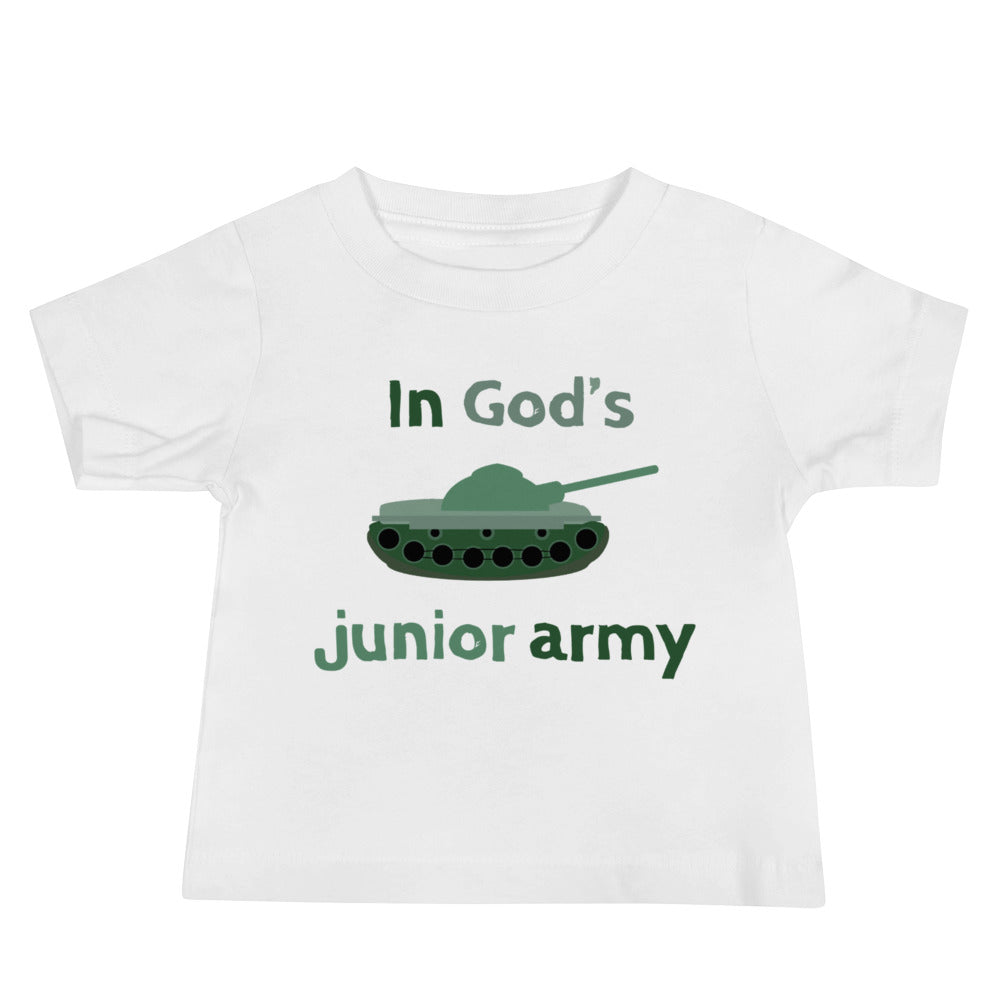 A graphic of a tank and the words "In God's Junior Army" are printed on this 100% combed and ringspun cotton baby and toddler tee.
