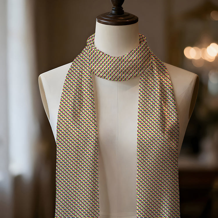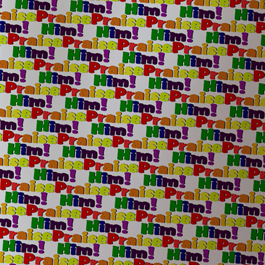 The phrase "Praise Him" is printed in colorful letters throughout this scarf. It is soft, lightweight, and versatile—able to be worn in several different ways. This scarf is available in two finishes: